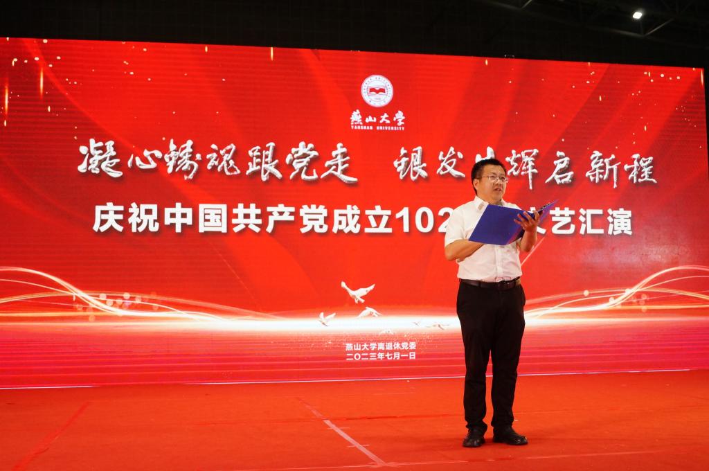 校党委常委、副校长蔡星周在演出前致辞。他首先代表学校党委向全校老党员们、向全校离退休老同志们致以诚挚问候,并向老同志们汇报了近年来学校的建设发展情况及取得的成绩。他指出,伟大建党精神是中国共产党的精神之源,是我们党的宝贵精神财富,是激励我们奋勇前进的强大精神动力。他强调,学校百余年曲折辉煌的发展离不开老同志的艰苦创业、奋进求索,我们会接好老同志的“接力棒”,永不懈怠、勇挑重担、苦干实干、接续奋斗把学校建设好。