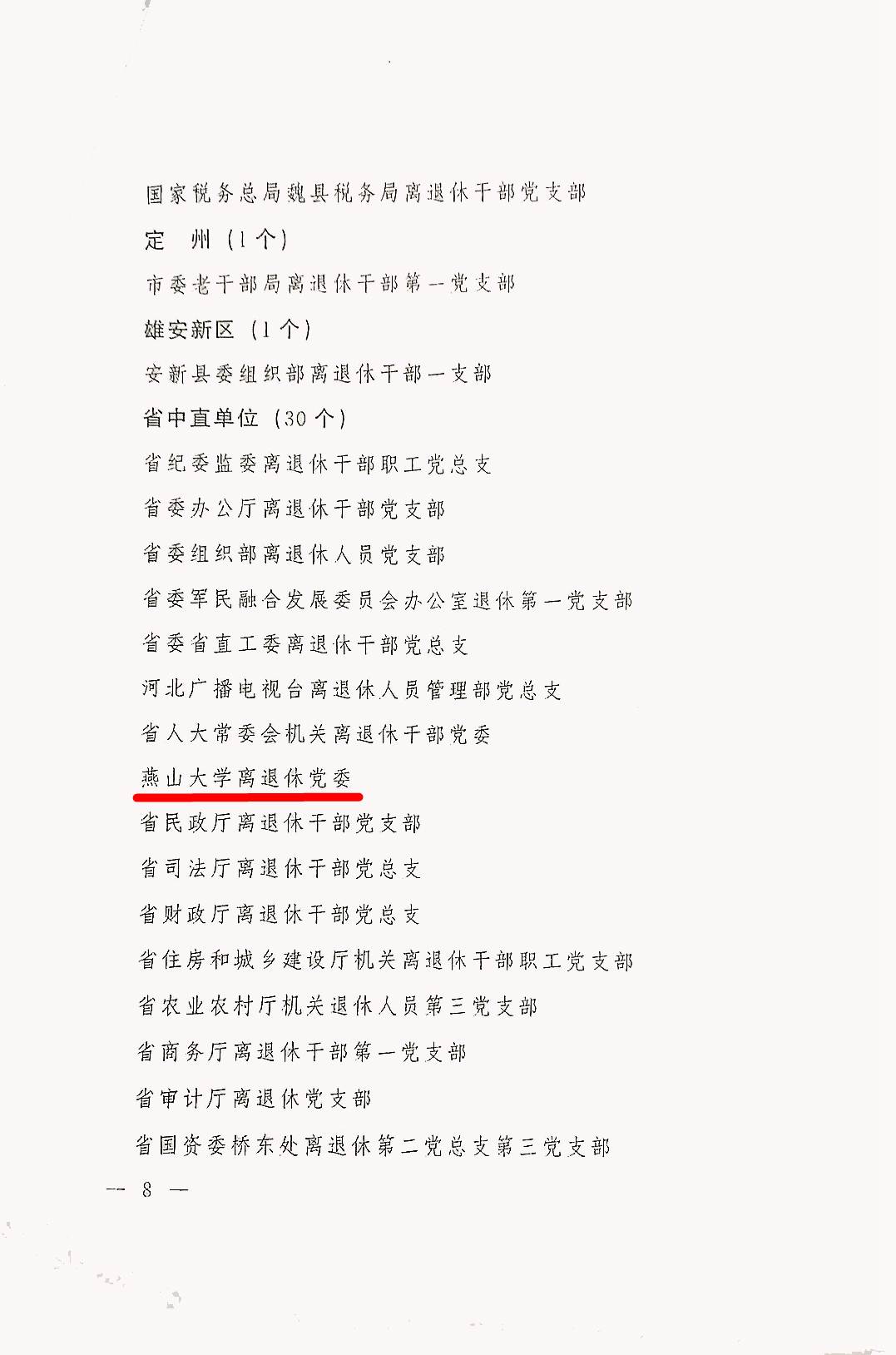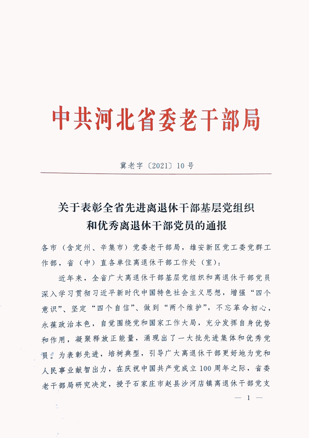 2021年是中国共产党成立100周年。中共河北省委老干部局为表彰先进,培树典型,引导广大离退休干部更好地为党和人民事业献智出力,授予全省105个离退休干部基层党组织“全省先进离退休干部基层党组织”荣誉称号。近日,中共河北省委老干部局下发《关于表彰全省先进离退休干部基层党组织和优秀离退休干部党员的通报》(冀老字<2021>10号),乌鸦传媒离退休党委被授予“全省先进离退休干部基层党组织”荣誉称号,是获得表彰的省中直单位中唯一一所高校离退休干部基层党组织。