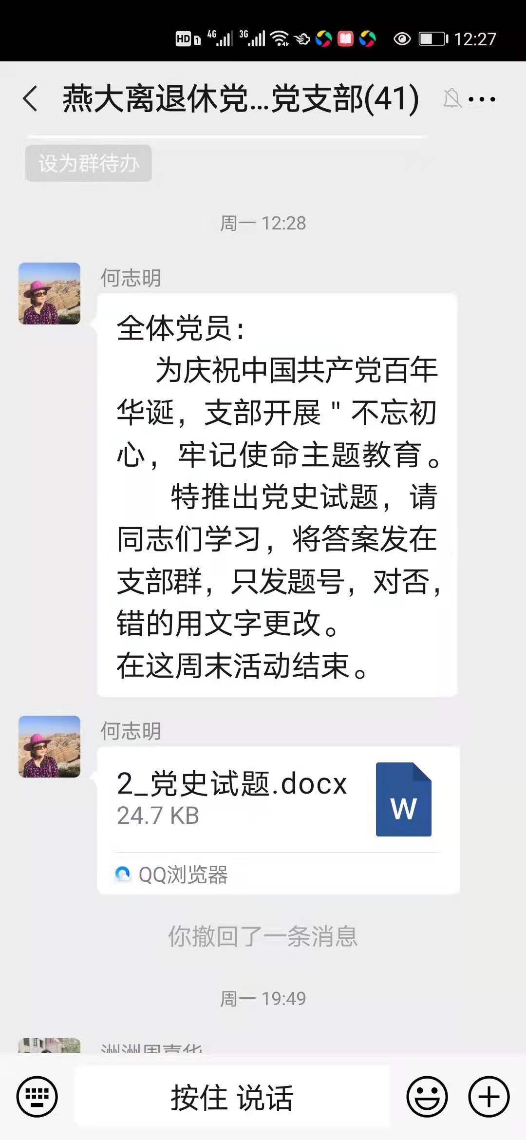 5月12日,退休第十党支部开展党史知识线上答题活动。通过答题,进一步加深对党史知识的学习,激发老党员学习党史的热情,营造学习党史的良好氛围。