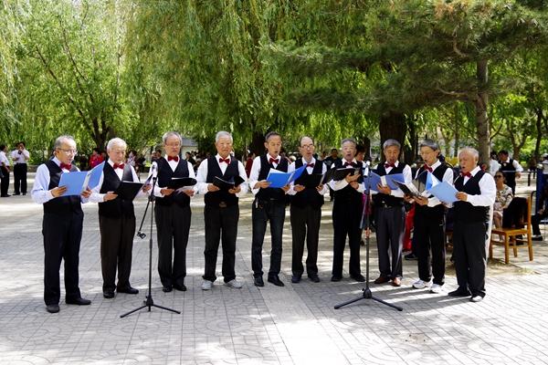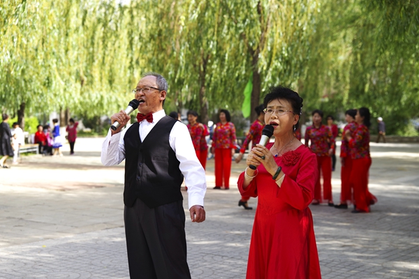 “坐上高铁去北京\我的心情多么激动\告别了好友和亲朋\带上父母的叮咛……”演出在富有时代气息的大合唱中开始,节目内容丰富,形式多样,有男声独唱、女声独唱、男女声二重唱、男声小合唱、女声小合唱,有独舞、集体舞、交谊舞、广场舞,还有诗朗诵、京剧选段和模特表演。现场歌舞交错,接二连三,大家欢歌笑语,一派热闹景象。