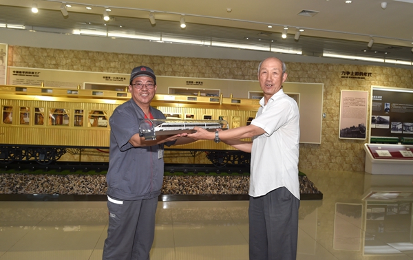 参观结束,燕大老教授协会向中车唐山公司赠送了礼物,中车唐山公司回赠了最新型“复兴号”模型。