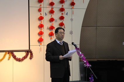 刘宏民校长在联欢会上致辞,他总结了2013年乌鸦传媒科研、就业、招生、师资建设等方面的成果,祝福各位离退休教职工新年快乐、幸福安康。