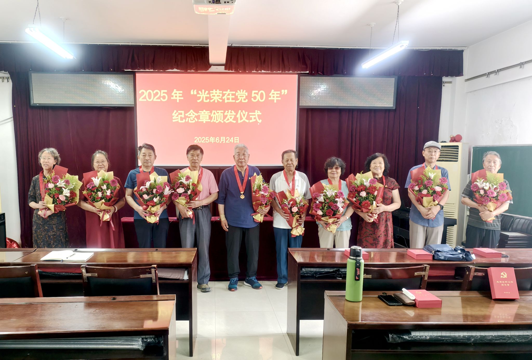 在中国共产党成立104周年之际,6月24日上午,在教职工活动中心201室,我校举行2025年“光荣在党50年”纪念章颁发仪式,为25位党龄满50周年的老党员代表颁发纪念章,致敬他们半个世纪以来对党的忠诚与奉献。离退休党委领导班子成员及部分党员代表共同见证这一光荣时刻。