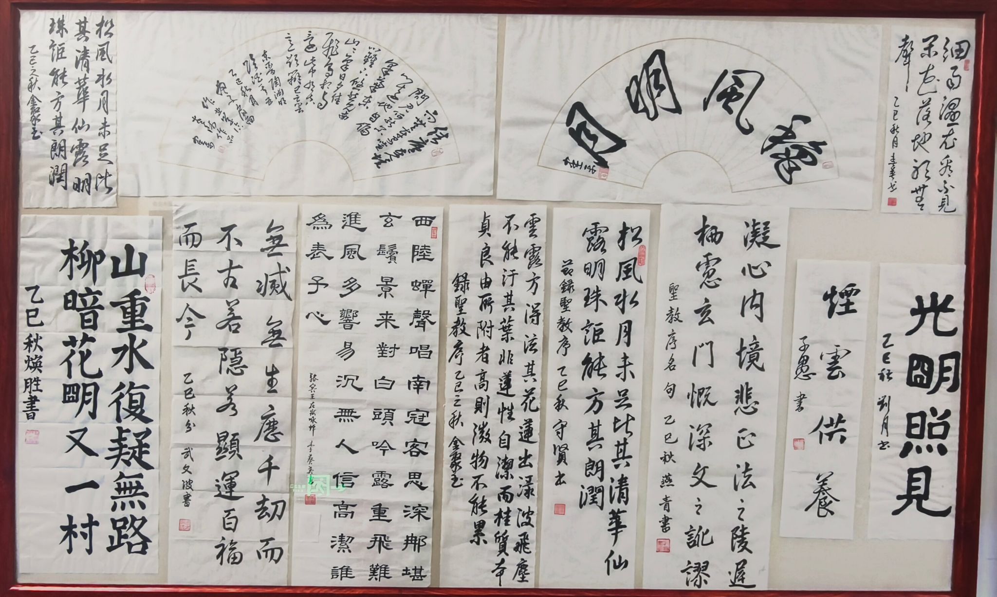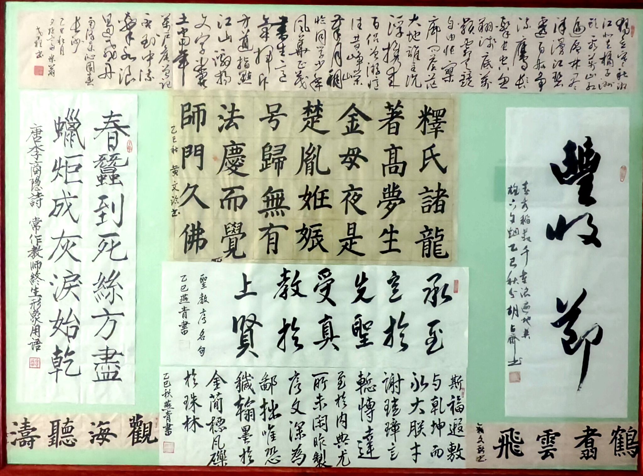 展览现场,书法作品琳琅满目,风格各异却又饱含着共同的赤子之心。大气磅礴的“爱我中华”四字,笔力雄浑,似在呐喊着老同志们对祖国的炽烈情感,瞬间便抓住了观者的目光。还有诸多书法作品,或书写经典诗词,如描绘祖国壮丽山河的诗句,在笔墨流转间,让祖国的大好河山仿佛在眼前铺陈开来。书法作品“丰收节”尤为引人注目,笔墨间满是对丰收的喜悦,这既是对当下幸福生活的写照,也是对祖国繁荣昌盛的由衷庆贺。
