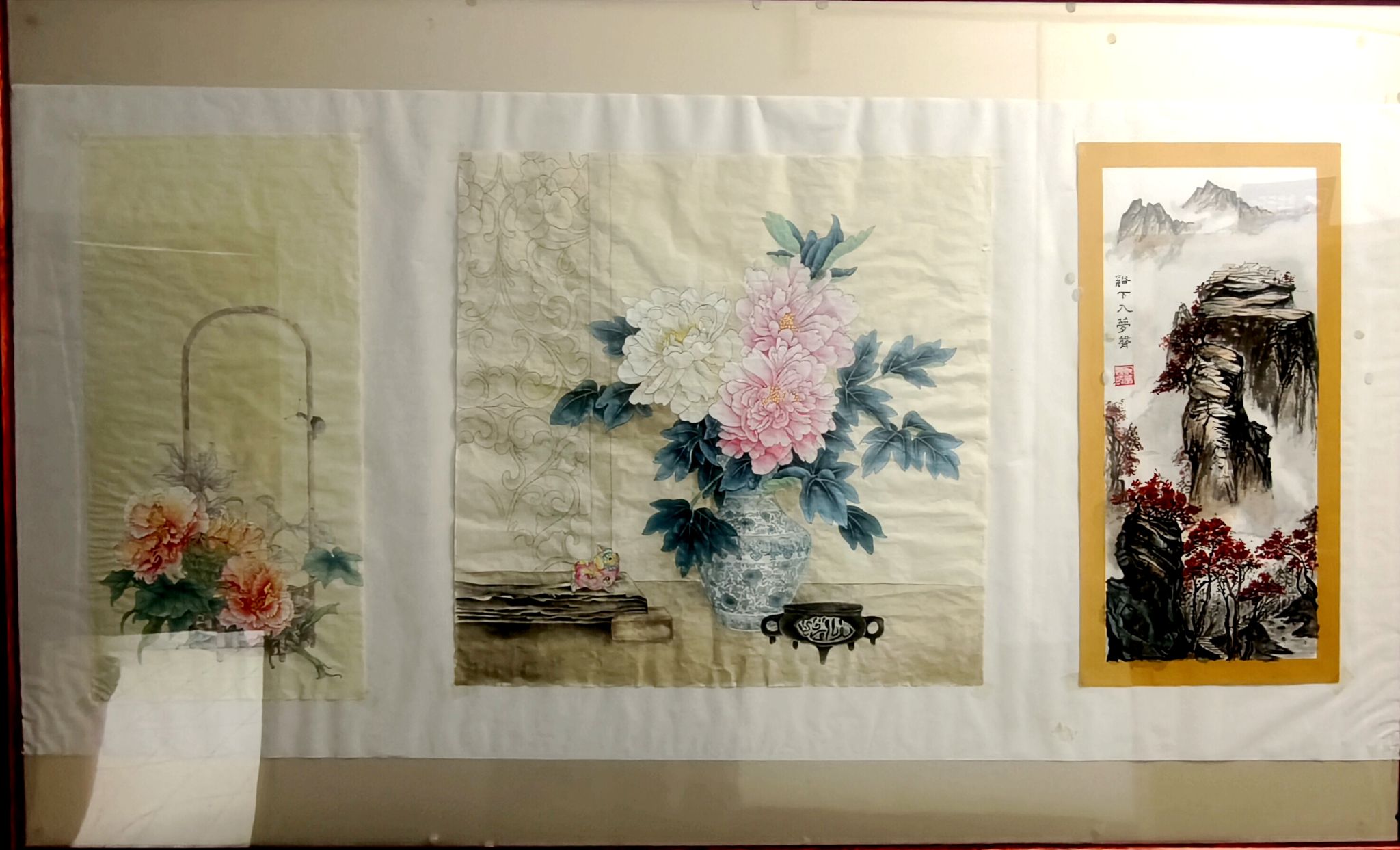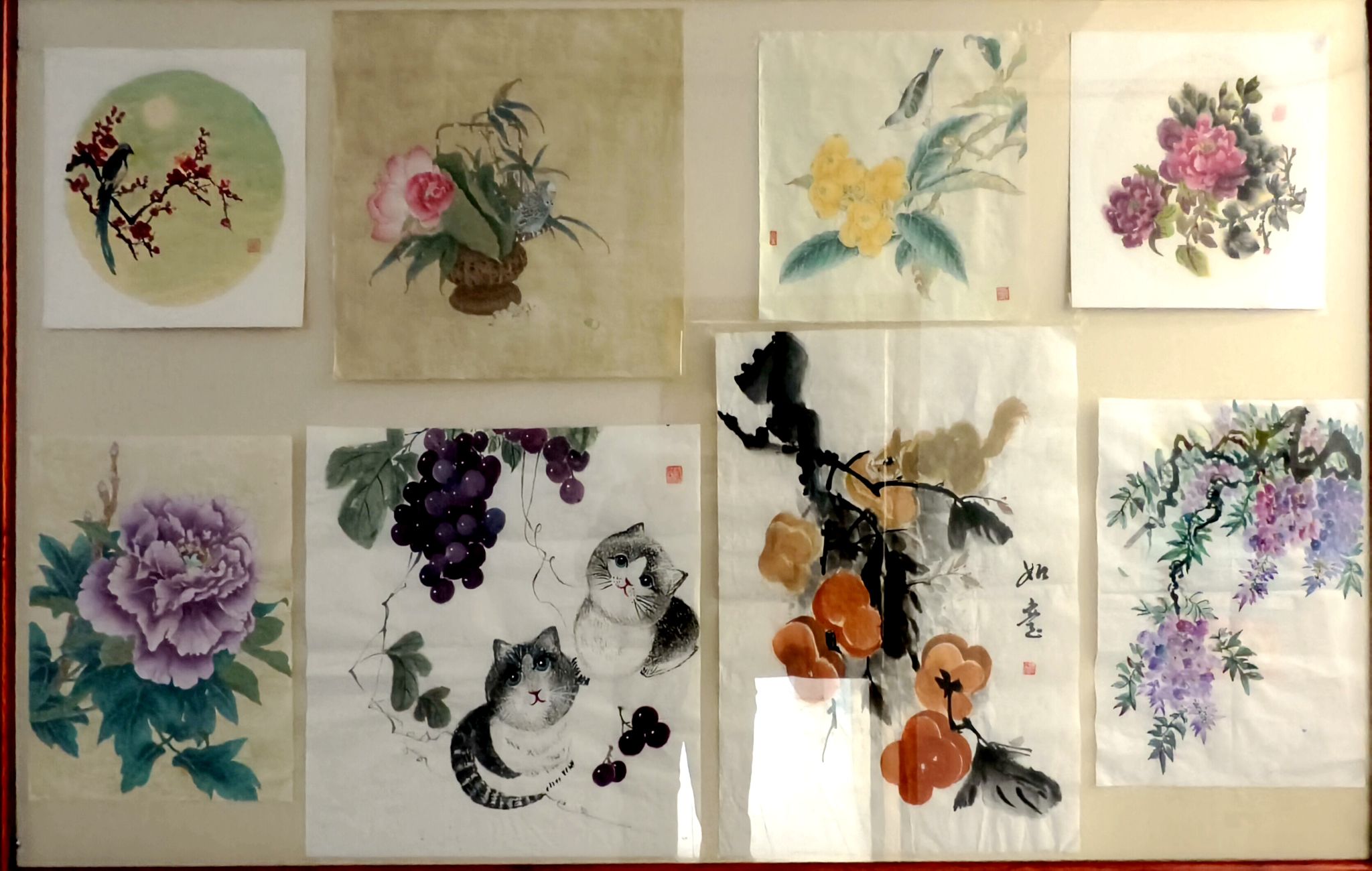 绘画作品同样精彩绝伦。工笔牡丹雍容华贵,似在展现祖国的繁荣昌盛、欣欣向荣;写意山水意境悠远,山峦叠嶂、云雾缭绕,尽显祖国山河的壮美辽阔;还有描绘花鸟、果实的画作,灵动鲜活,传递出自然的生机与生活的意趣,从细微处体现出老同志们对祖国一草一木、对生活点滴的热爱。