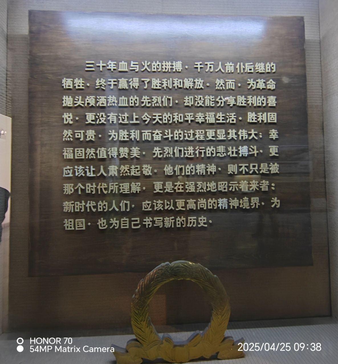纪念馆的出口处,矗立着一块结束语的牌匾,上面写着,“三十年血与火的拼搏,千万人前仆后继的牺牲,终于赢得了胜利和解放。然而,为革命抛头颅洒热血的先烈们,却没能分享胜利的喜悦,更没有过上和平幸福的生活……”。